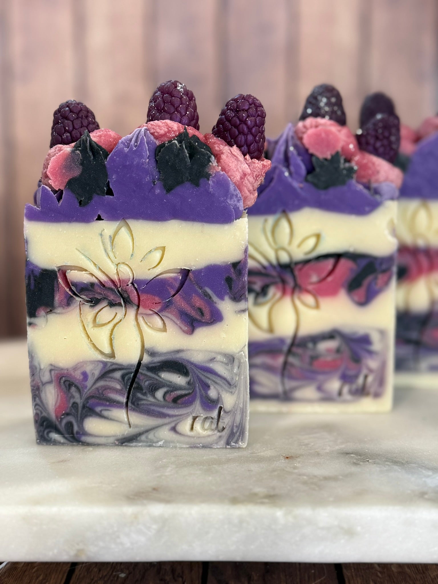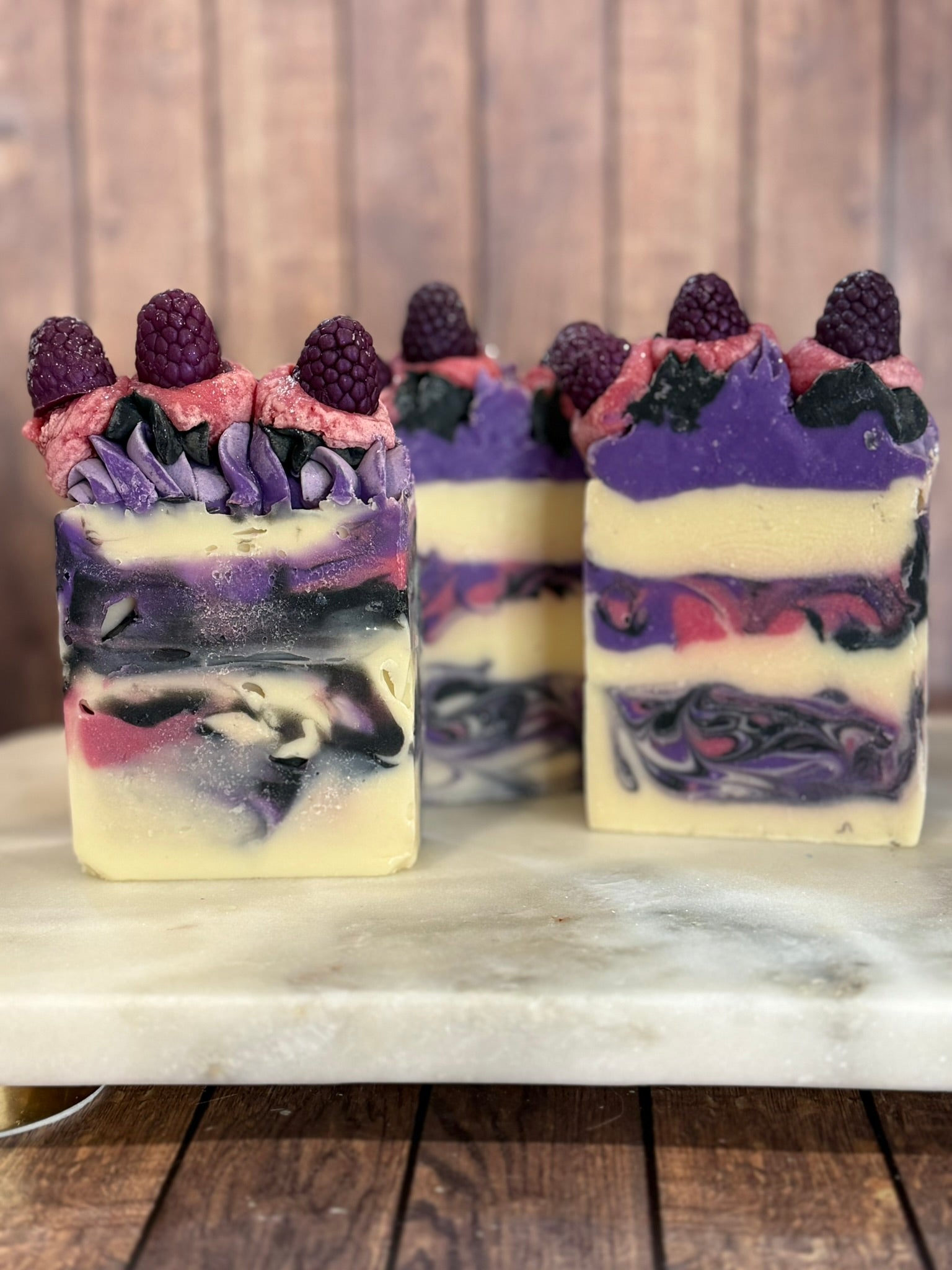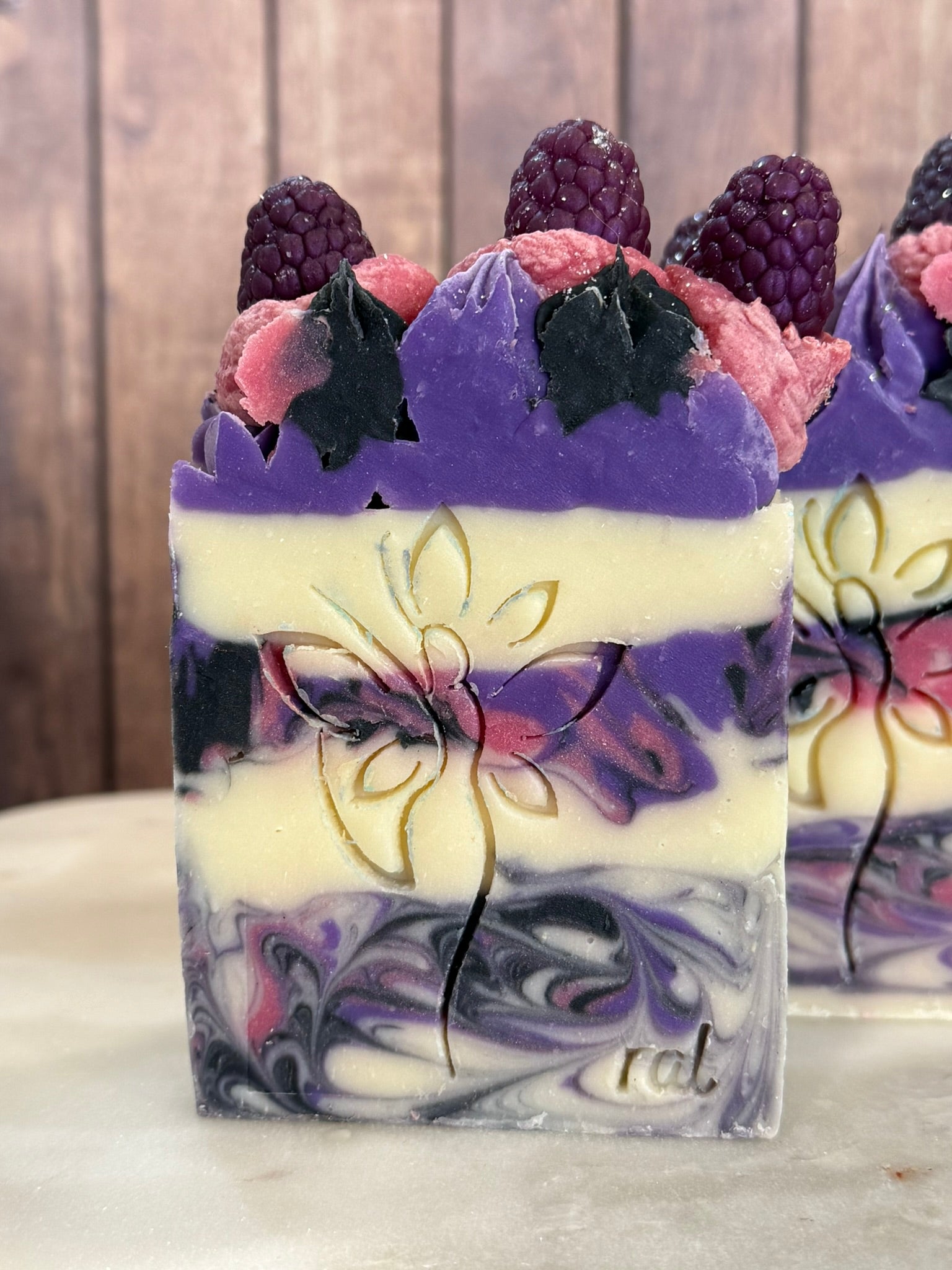A perfect blend of rich berries and creamy sweetness, this handcrafted soap is as beautiful as it is indulgent. Juicy black raspberries and sun-ripened berries create a deep, luscious aroma, while smooth vanilla adds a touch of warmth and comfort. A hint of soft musk rounds out the fragrance, leaving a clean yet cozy finish.