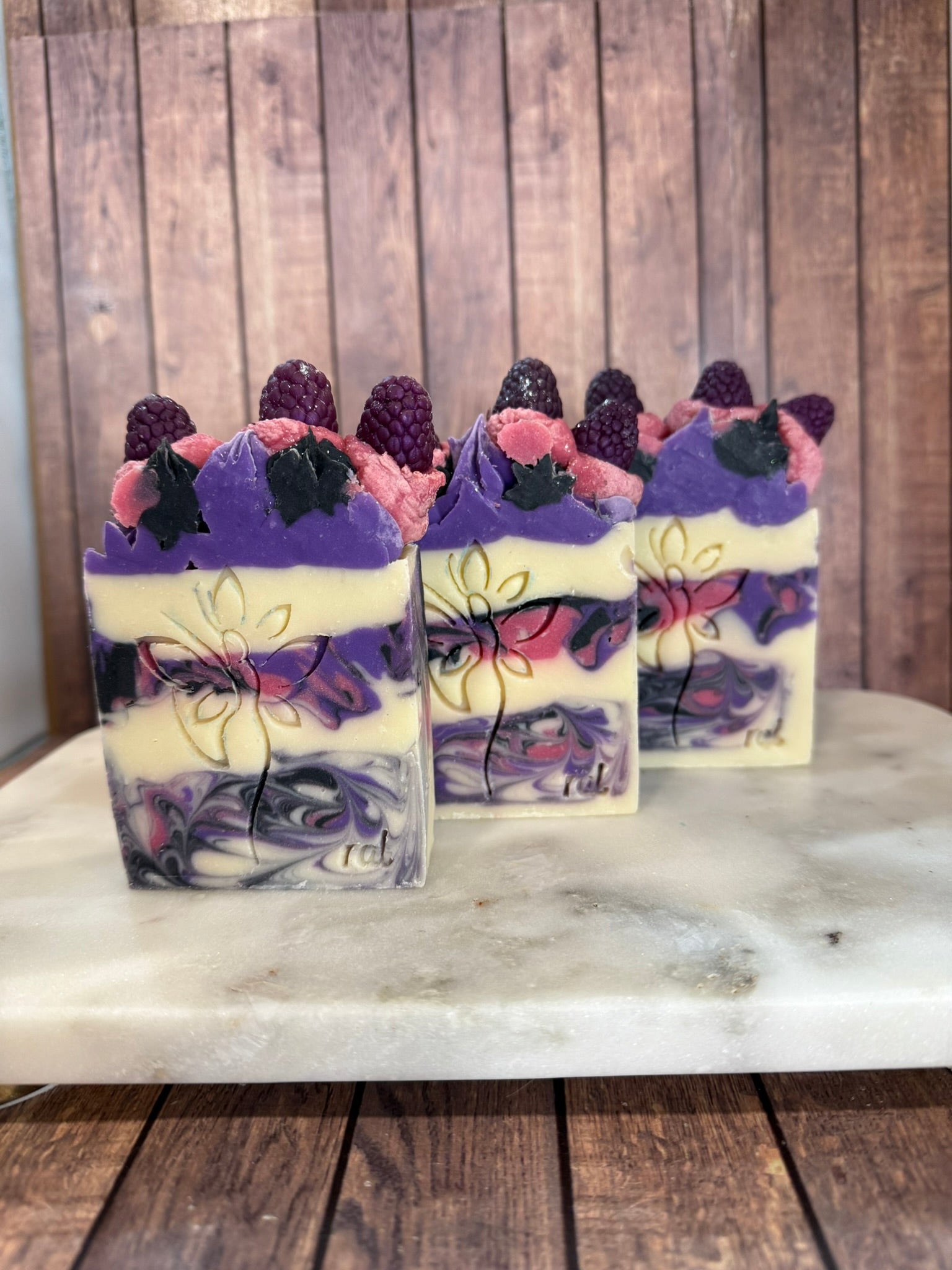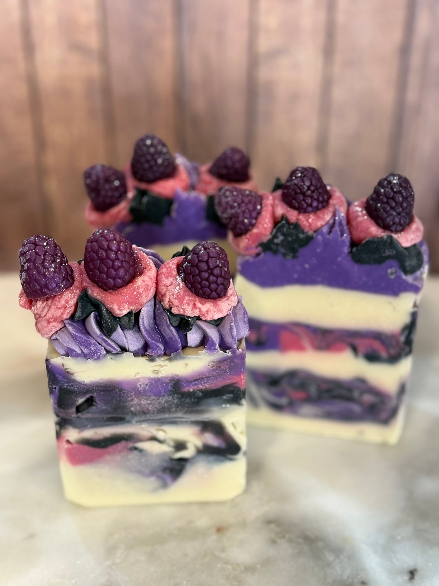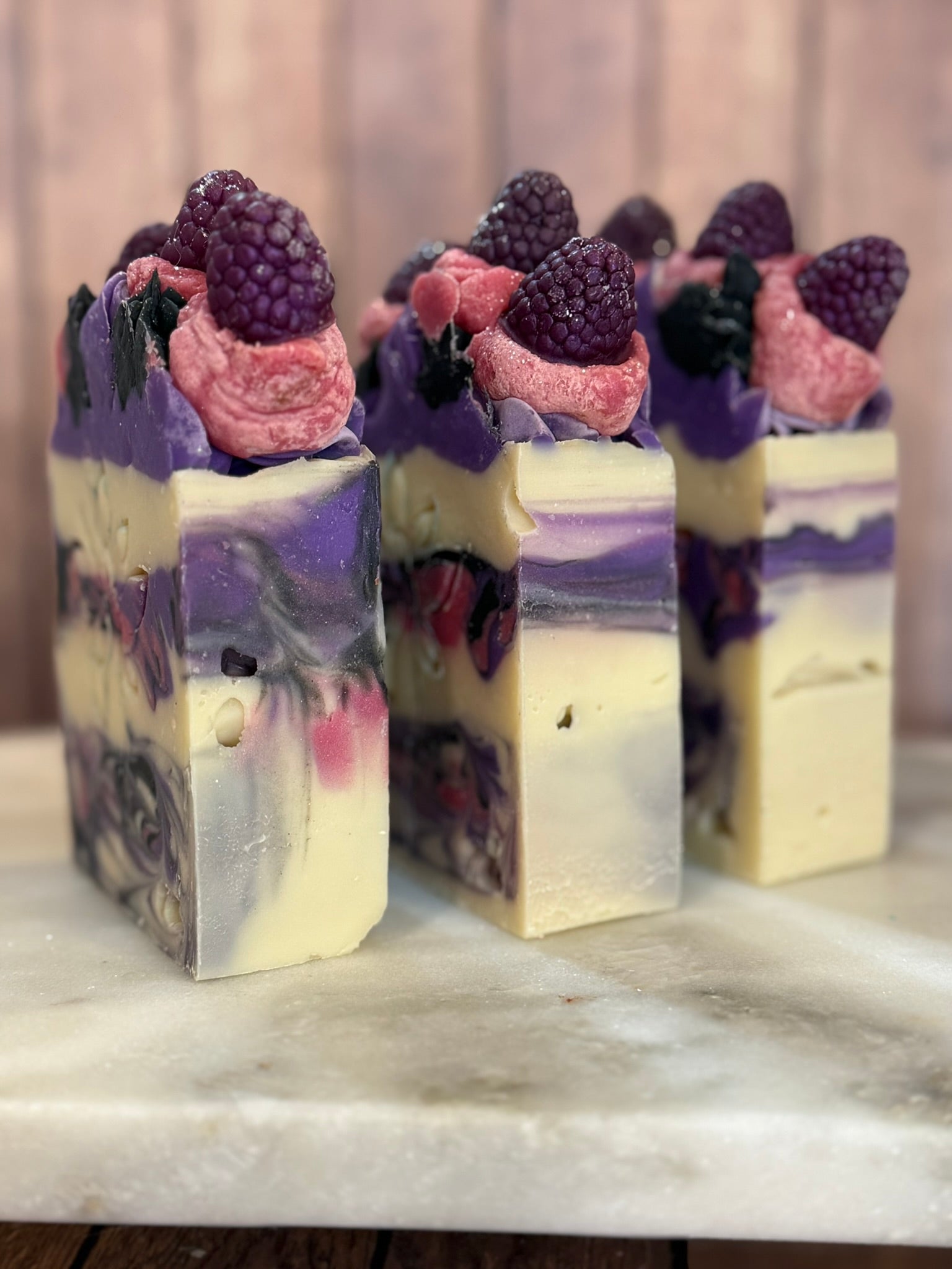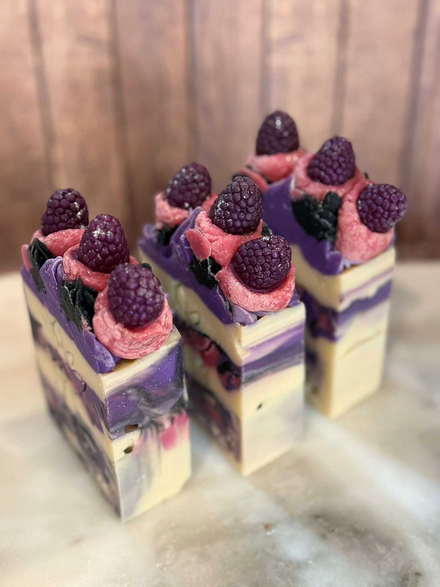A perfect blend of rich berries and creamy sweetness, this handcrafted soap is as beautiful as it is indulgent. Juicy black raspberries and sun-ripened berries create a deep, luscious aroma, while smooth vanilla adds a touch of warmth and comfort. A hint of soft musk rounds out the fragrance, leaving a clean yet cozy finish.