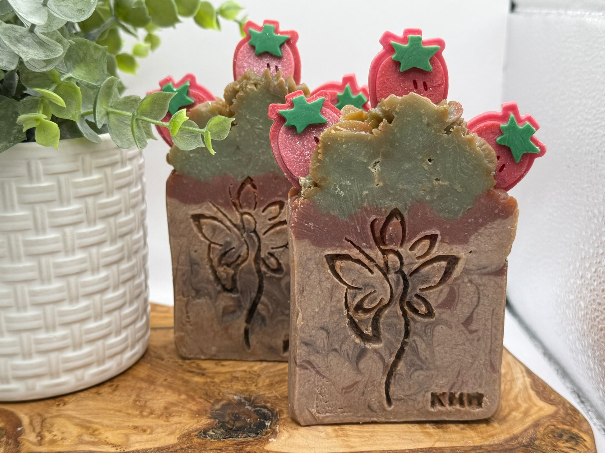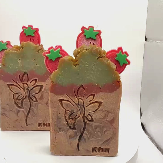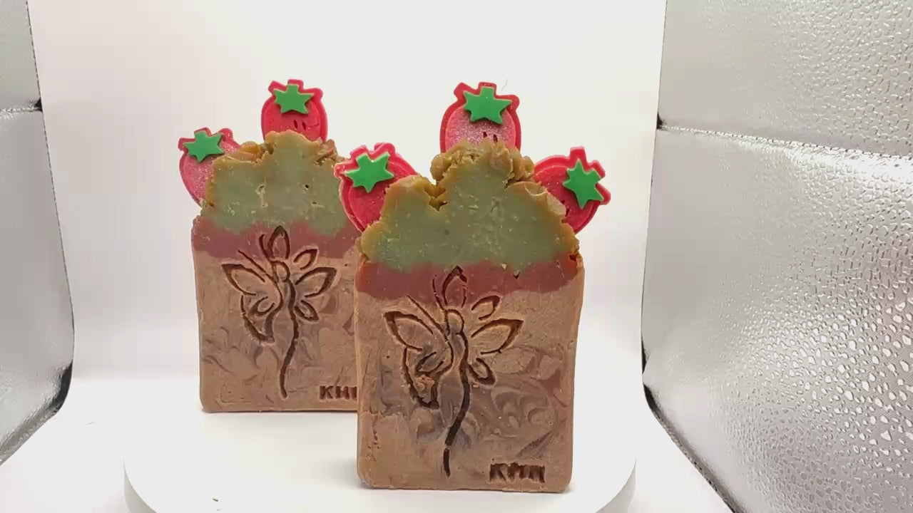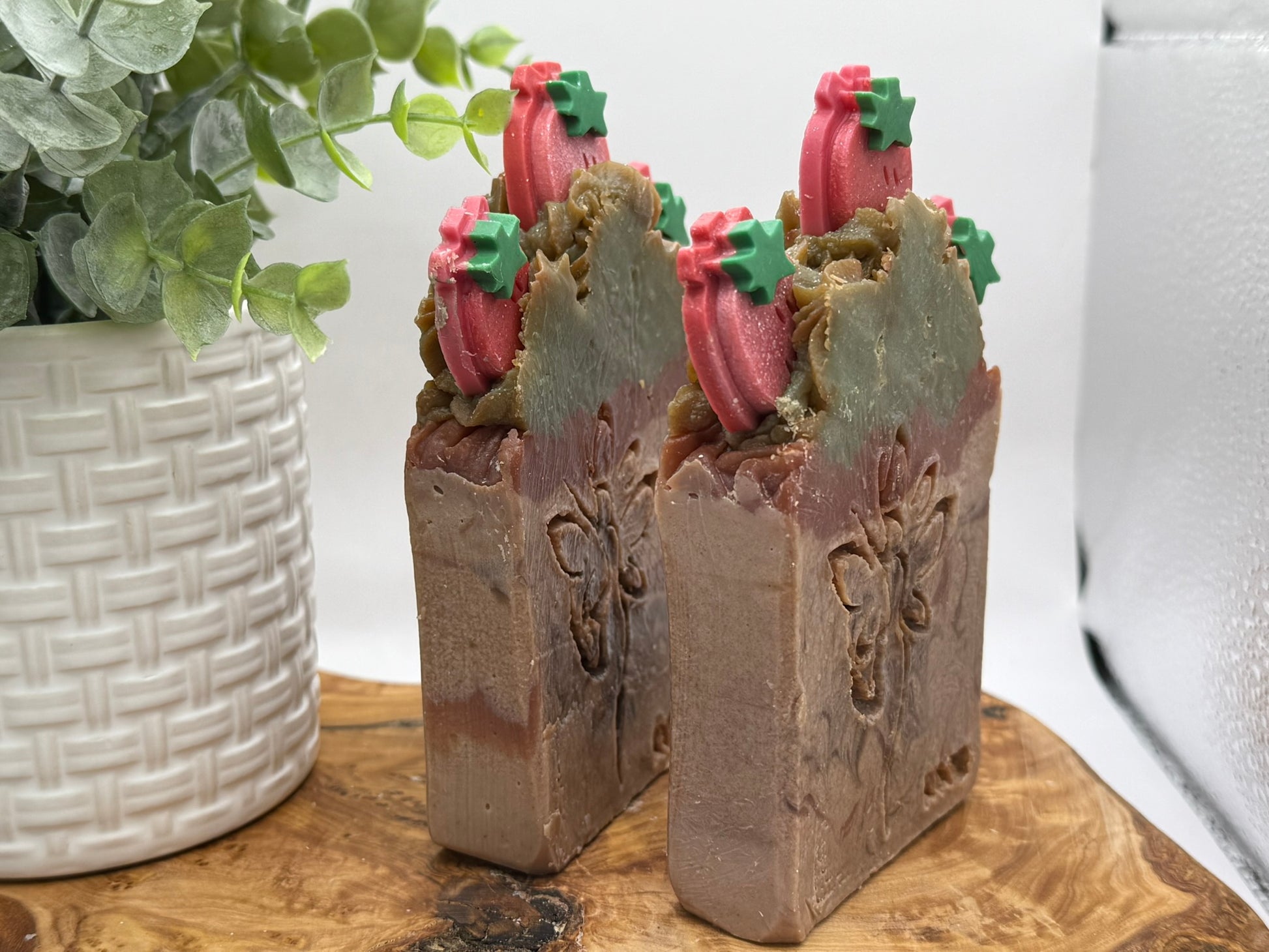 Decadent, sweet, and almost good enough to eat — Chocolate Covered Strawberry is a delightful cold process soap that brings dessert to your shower. Swirled in soft shades of pink and rich cocoa brown, each bar is topped with an adorable strawberry embeds that adds a charming touch of whimsy.