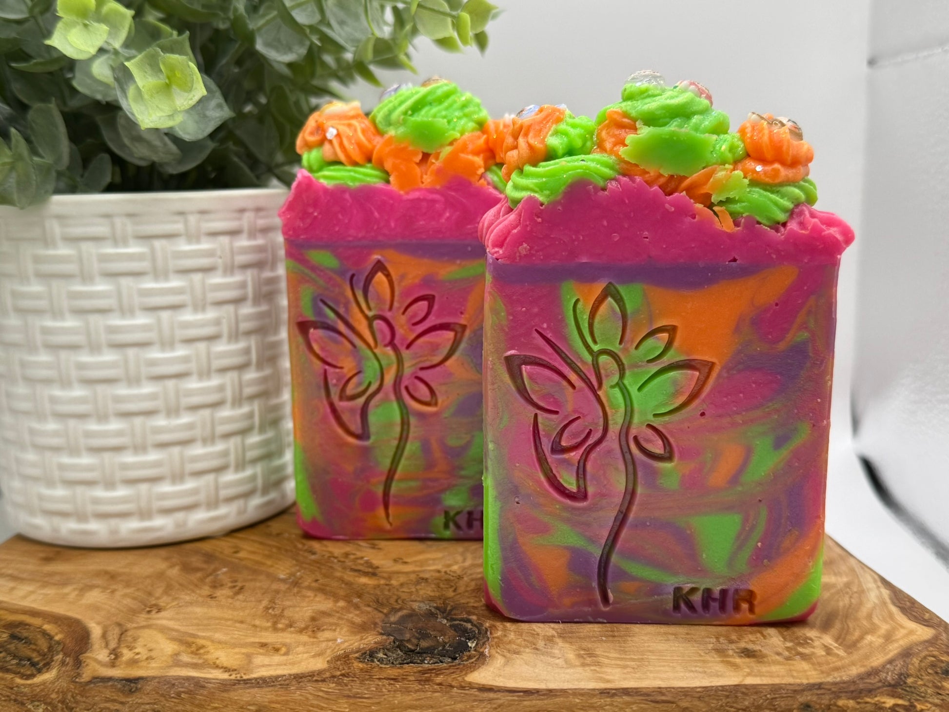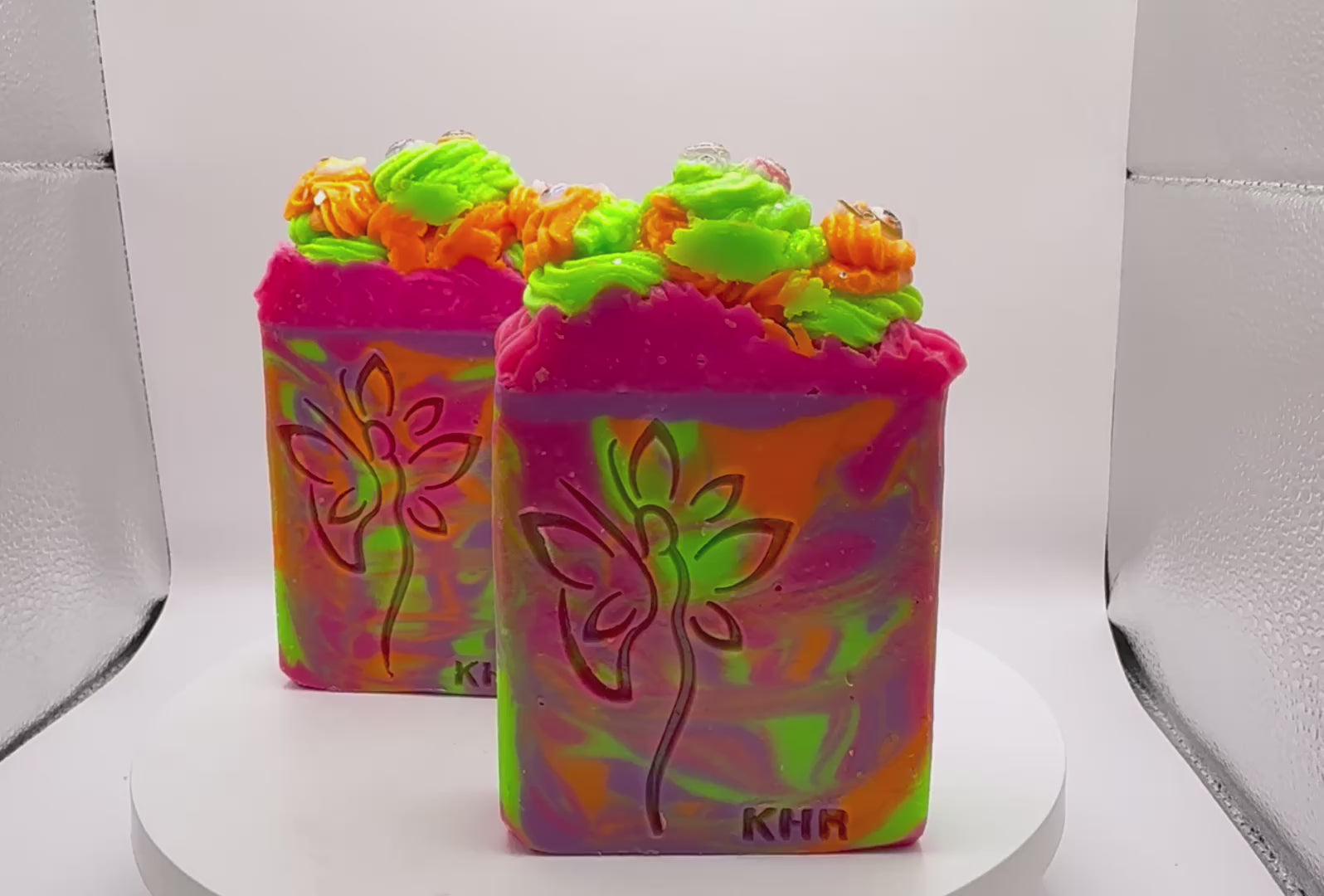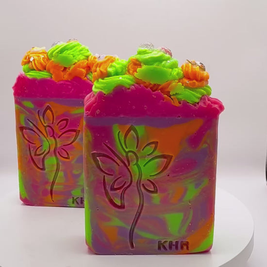 Experience the artistry of Monster Soda Pop, a handcrafted cold process soap designed to delight the senses. This luxurious bar layers a vibrant fragrance blend of juicy orange, ripe cherry, peach, pineapple, and smooth vanilla, paired with the sparkling notes of grape, raspberry, and effervescent club soda, delicately sweetened with sugar. Each bar is a visual masterpiece, featuring fluorescent swirls in bold neon hues and topped with intricate frosting adorned with whimsical acrylic Labubu charms. Crafted with a nourishing blend of premium butters and oils, this soap provides a rich, creamy lather that cleanses while leaving skin soft and refreshed. Both playful and refined, Monster Soda Pop is a statement piece for your bath routine or an unforgettable gift.