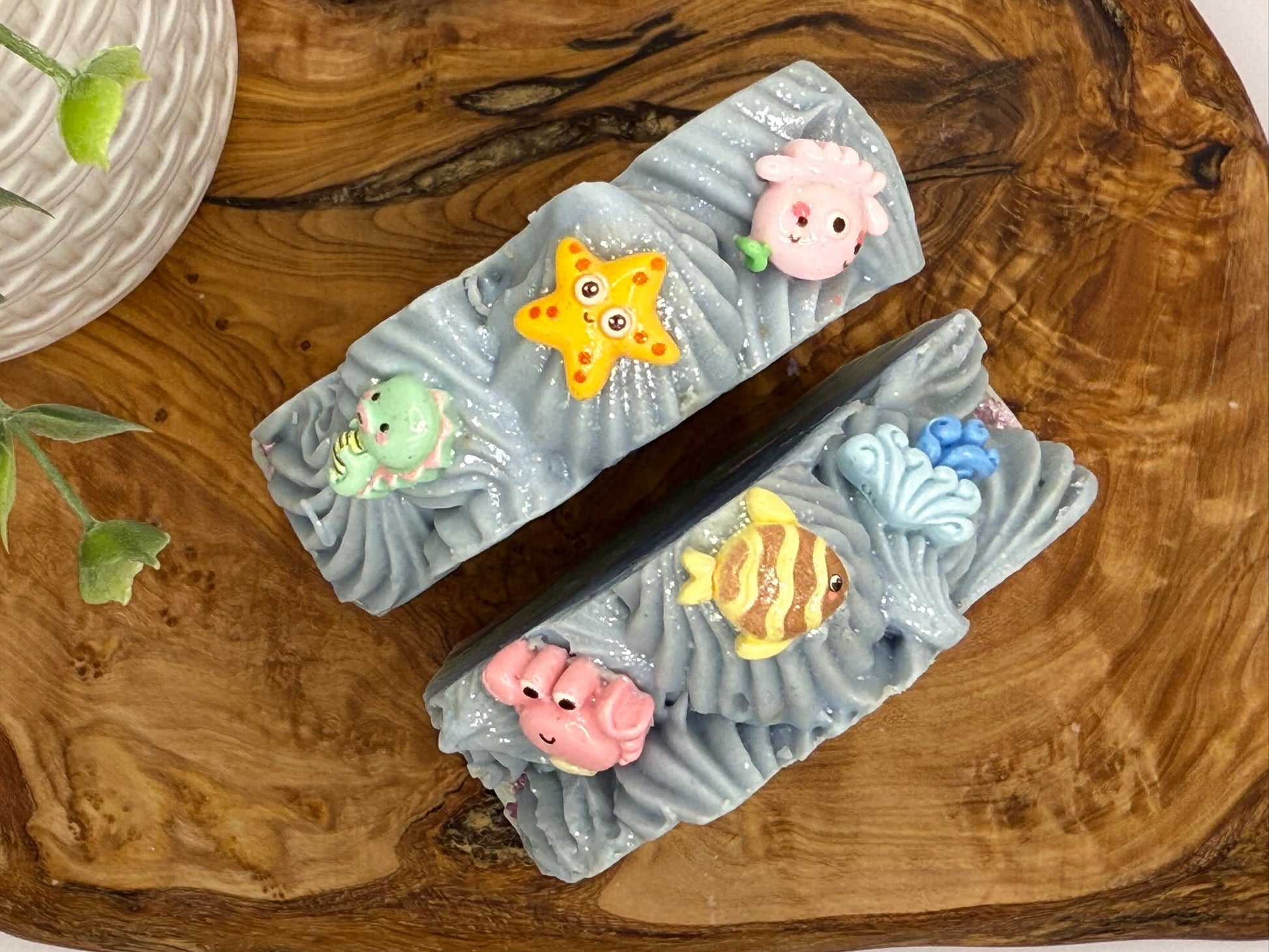 Welcome to your ocean get away. This fragrance is an elegant aroma of tropical orchid, jasmine and white musk with hints of sea salt and ozone. Topped with cute acrylic ocean characters.