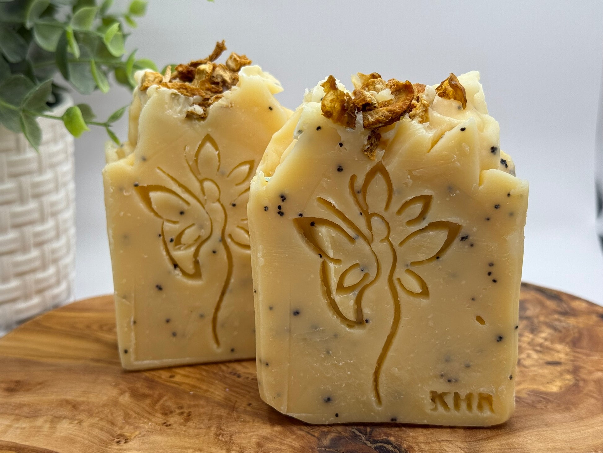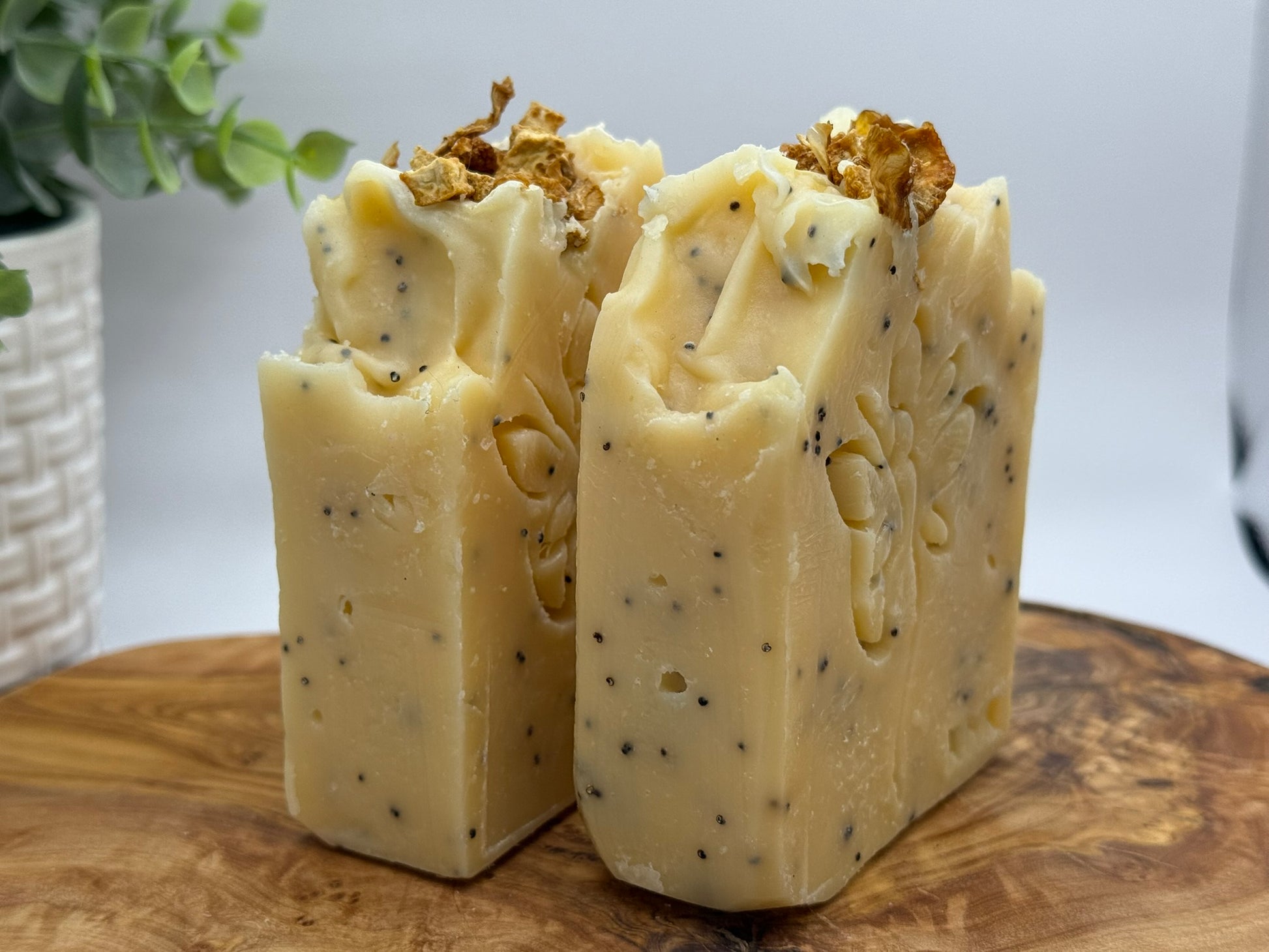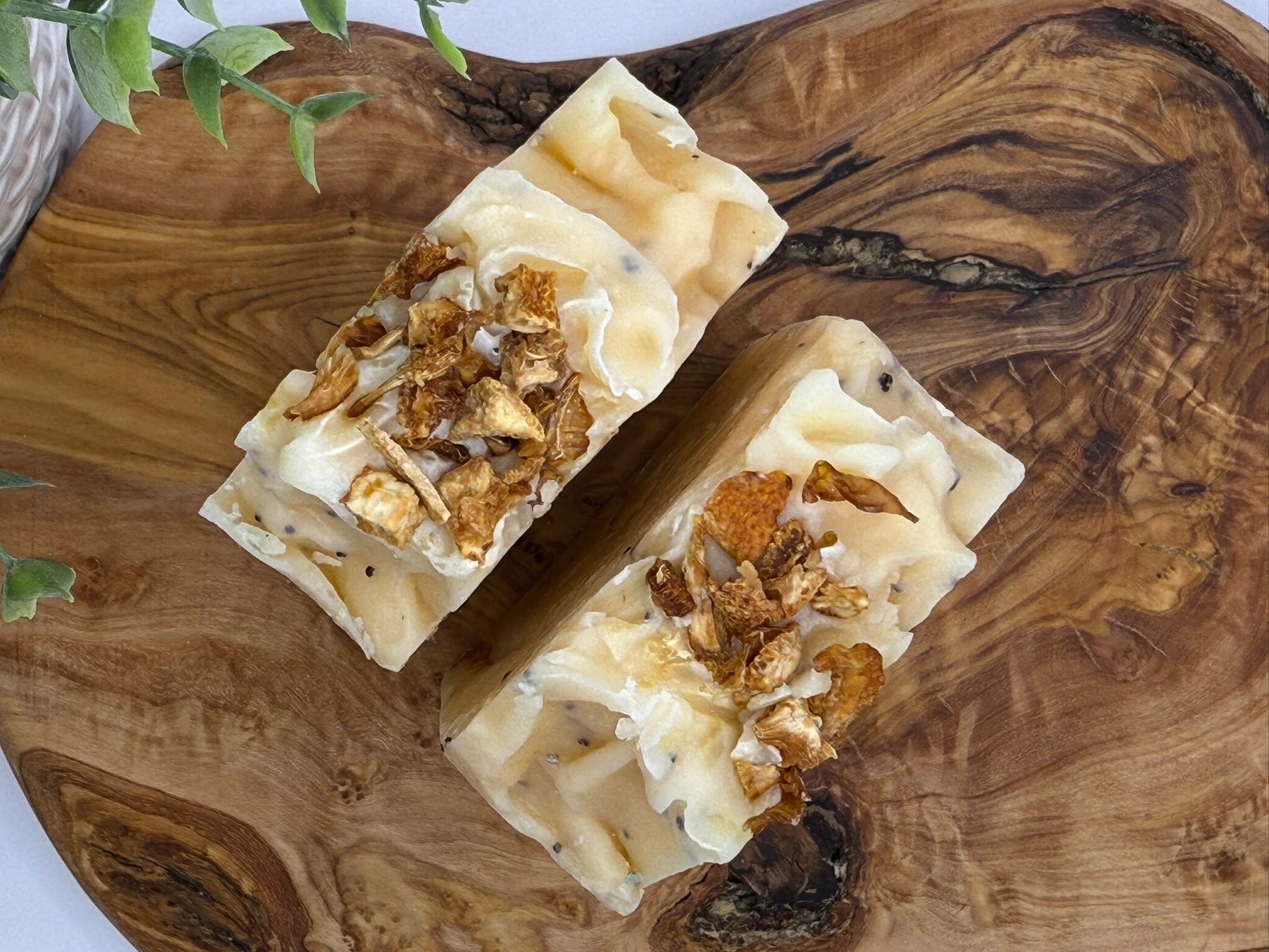 Handcrafted using the cold process method, each bar creates a creamy lather that leaves your skin feeling clean, soft, and lightly scented. The gentle exfoliation from the orange peel adds a natural touch, making this bar as beautiful as it is refreshing.